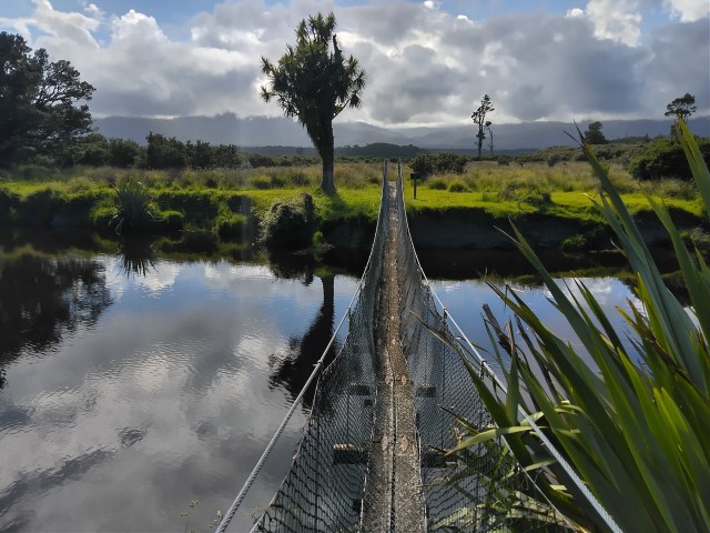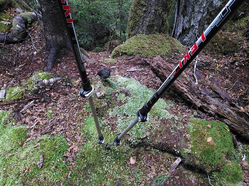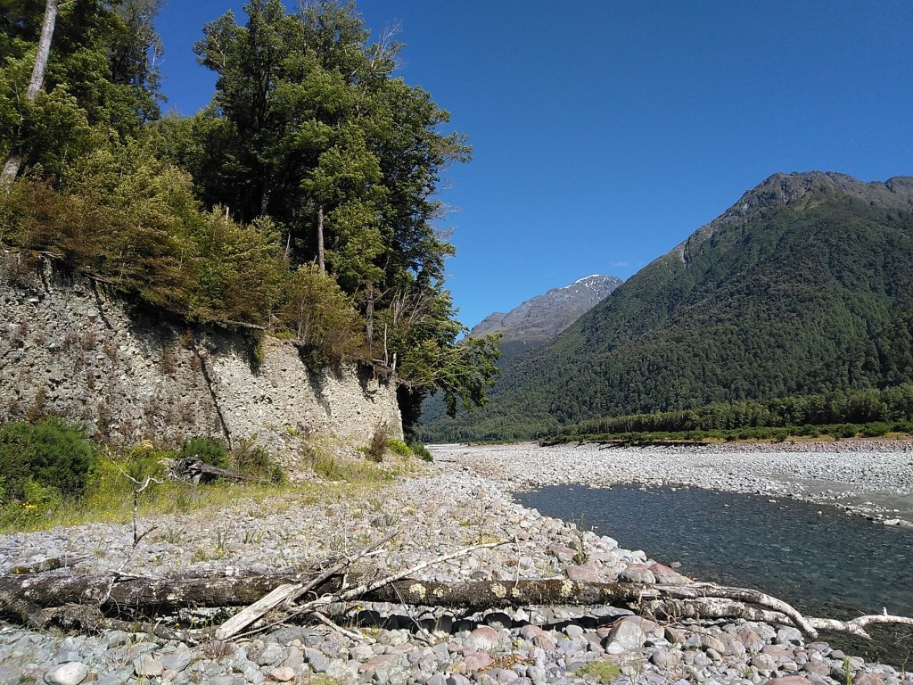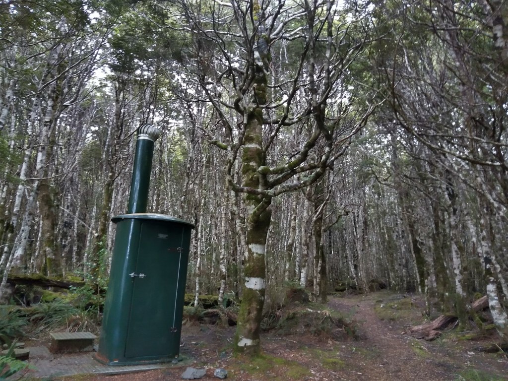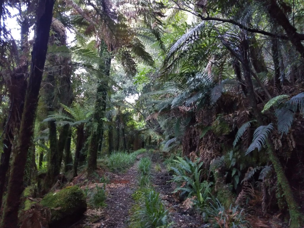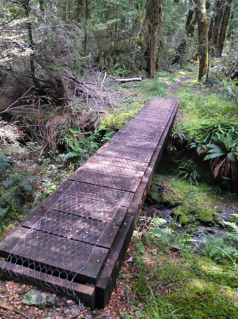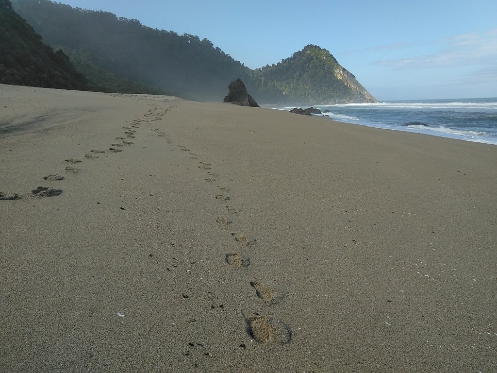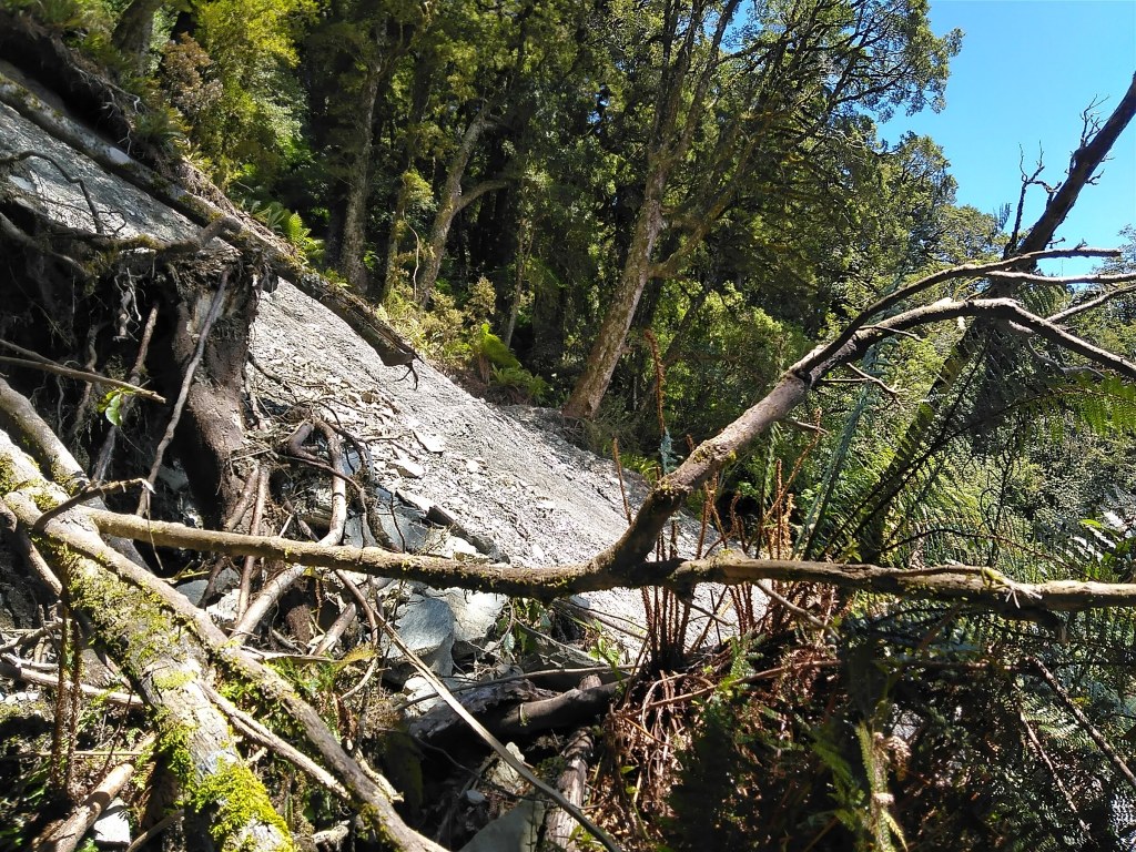 Kdybych na brožuru o historii téhle první silnice jihozápadního pobřeží narazila už v první chatě, ne až v poslední, nebyla bych tak překvapená. Takhle mě realita místní divočiny, se kterou se potýkali už stavitelé stezky cca 1880, dostihla záhy: močály a komáři dole při haastském pobřeží (ano, poprvé komáři vyhrávají konkurenční boj nad muchama a musím říct, že dávám přednost sendflies: jsou tiché a pomalé, daleko ochotnější nechat se rozmáznout na stěny mého stanu), všude hromady spadlých stromů a pak to příjde: sesuvy půdy. Některé hodně čerstvé a některé fakt pře- a obšplhané s modlením a sevřenýma půlkama.