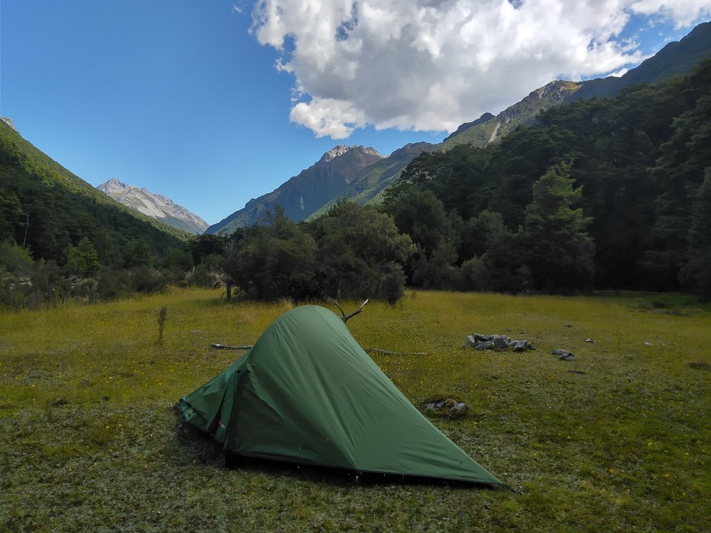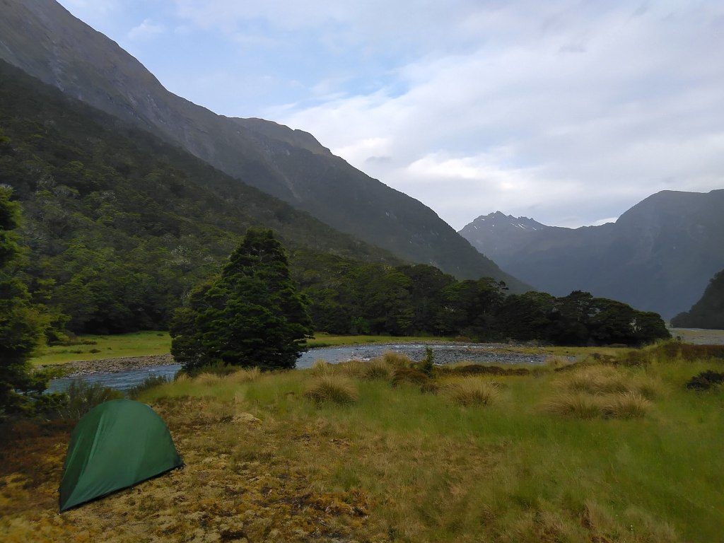 Po 7 hodinách šlapání a asi 8 broděních téže řeky tam a zpět, s báglem narvaným jídlem na 7 dní, už jenom toužím to někde zapíchnout a strávit pohodový Štědrý večer u řeky, s výhledy a hlavně sama. Chata Upper Forks hut je sice nedaleko, ale tam mám v plánu dojít až zítra. Má celý den chcát, takže je jedno, kdy se tam doplazím, bude to pošmourný Boxing day. Takže rozbíjím tábor pod vánočním stromkem a otvírám flašku vína k štědrovečeři (ano, tahám to až sem, ale pač praktická žena jsem, upila jsem včera a zbytek přelila do petflašky. Nemám ani sílu nic vařit. Na zuby taky tentokrát prdím. Veselé Vánoce!
