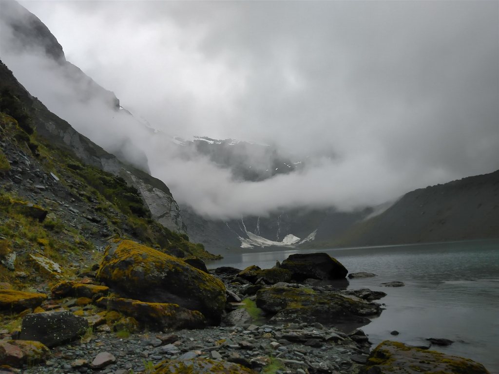 Úplně se to za celý den neroztrhalo, ale taková mlhavá koupel v morénovém jezeře Lucidus má taky svoje kouzlo (vydržela jsem 2 tempa a rychle ven! kosa jak cyp)