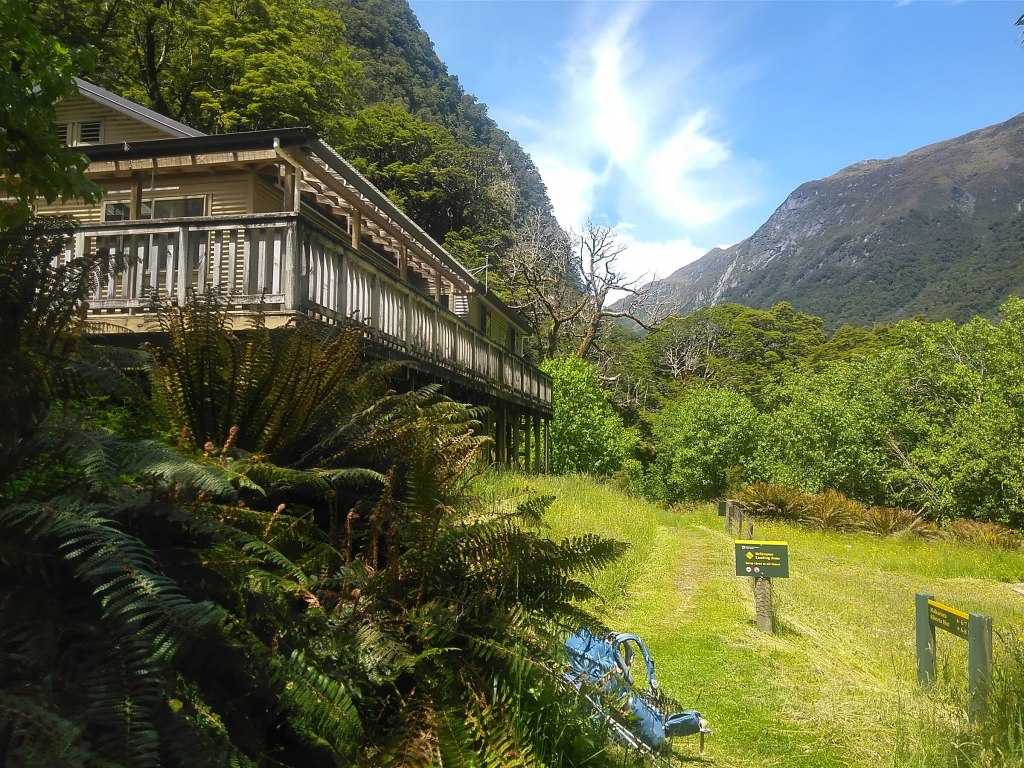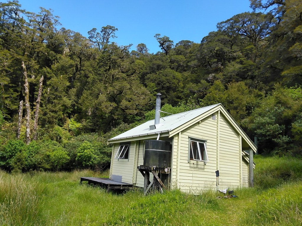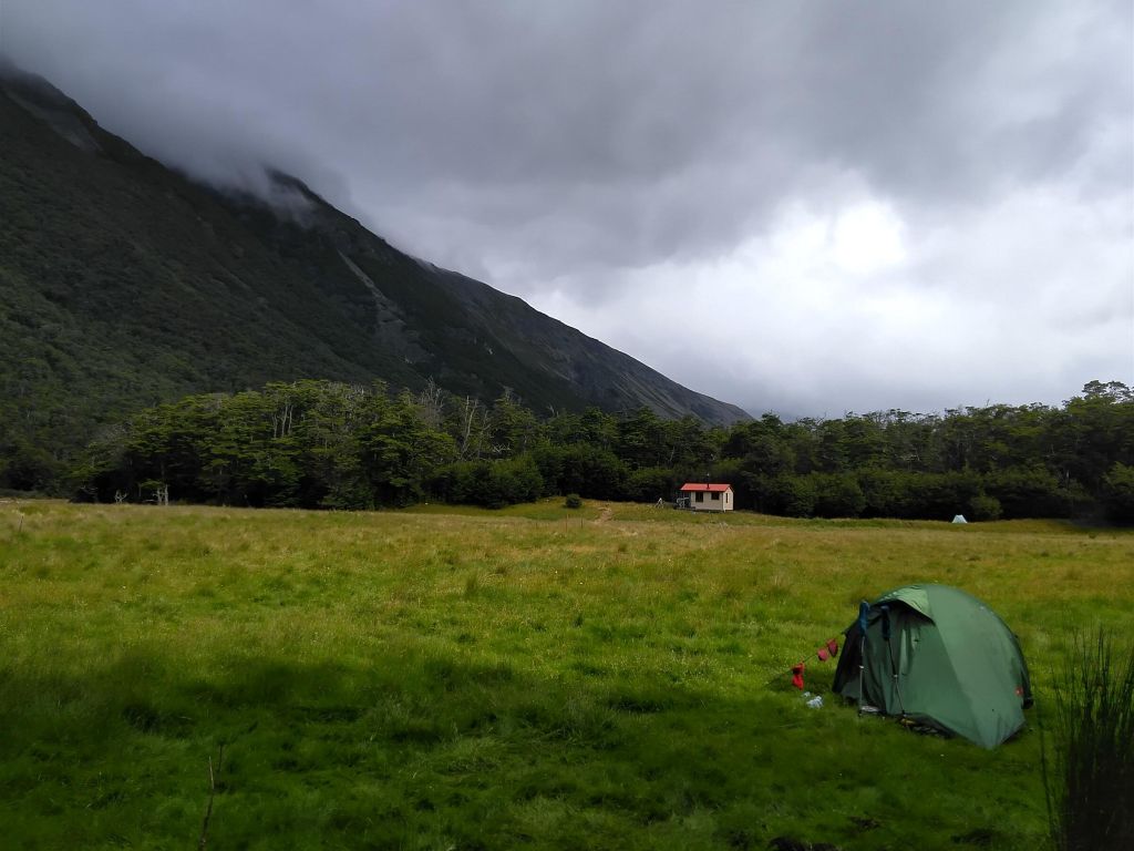 Příchod s deštěm k Waiau hut. Vevnitř už se tísní aspoň 10 lidí. Jsem moc spokojená, že mám stan.