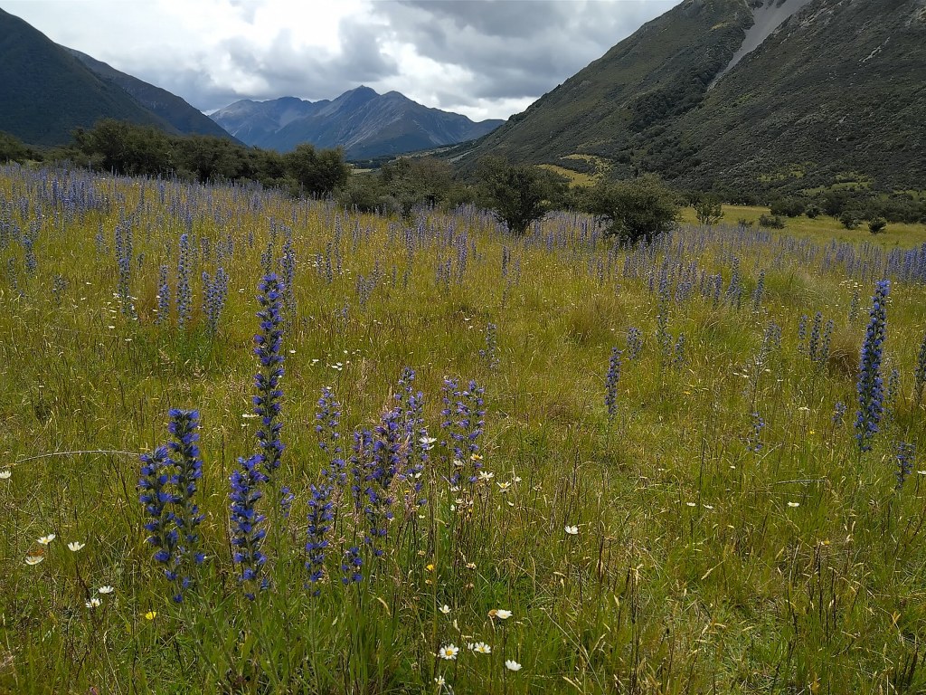 Potřebovala jsem se nutně projít co nejvíc a tady se to přímo nabízelo: pětidenní spojnice mezi Arthur’s pass a Lewis pass je součástí Te Araroa, značené trasy napříč celým NZ. Nechcu ale potkávat moc lidi, takže se snažím jít tak, abych se vyhnula chatám, někdy za místem na stan brodím na druhou stranu řeky (žádní lidi, jen krávy), hodně spím a jdu dlouho do večera, protože se mi prostě takhle zrovna chce – tím se zároveň vyhýbám ranním davům, ale ani tak tu skoro nikoho nepotkám.