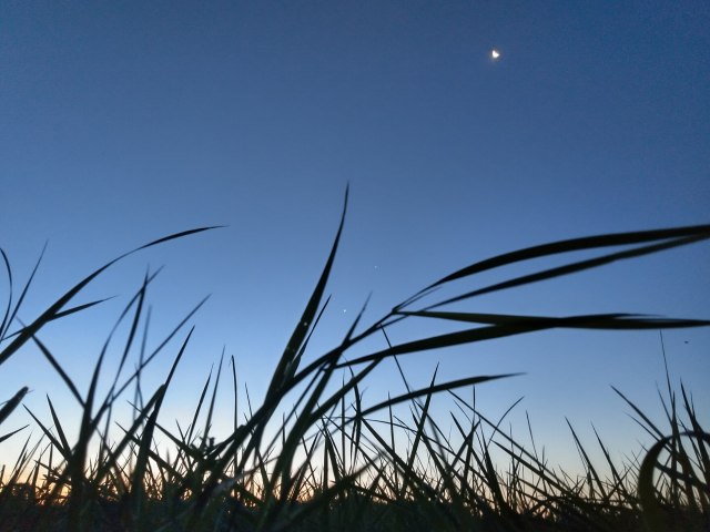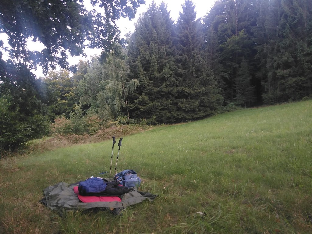První nocleh volím strategicky nad potokem u lesa na jediném rovném plácku na okraji sjezdovky uvažujíc, že v létě mě tady sotva co přejede, ať už lyžař, nebo rolba. Podcenila jsem ovšem pracovní vzepětí místních zemědělců. Jak se po týdnu chcance udělalo hezky, všichni vyrazili žnout! Ne že by tedy žali přímo tu mou louku, ale zpoza křa se ze sousedních polí ozývá rachot kombajnu a náklaďáku ještě dlouho po setmění. Po desáté to konečně zabalili a já mám klid a po strašně dlouhé době noční nebe s hvězdami jen pro sebe, dokud se asi ve 2 v noci o ně nezačnu dělit s měsícem, který šajní jak zjednaný, že mám skoro chuť výt až do hodiny mezi psem a vlkem, ale jsem na to příliš ucaprtána.