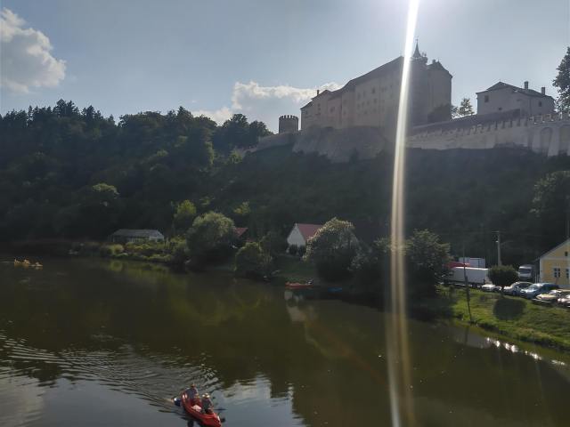 Třetí den ráno mě čeká sestup do Vlašimi. Je to dost mezi poli, ale vyrazila jsem opět brzo a fouká příjemný osvěžující vánek. Vypadá to, že snad nejhorší den veder už mám za sebou. Vlašim, o které jsem věděla jen to, že odtud byl Jan Očko z Vlašimi, Karlův důvěrník a druhý arcibiskup český, mě velice příjemně překvapila. Nejdřív krásným zámeckým parkem, jímž jsem se přiblížila do centra, potom krásným a udržovaným zámkem (ještě zavřeno) a do třetice Žižkovým náměstíčkem, kde byly hned 3 otevřené podniky kafíčkového typu najednou! Vybrala jsem si Rodinnou cukrárnu ve Vlašimi a posilnila se druhou snídaní na následující dlouhou cestu podél řeky Blanice (stínek, mnoho koupaček a studánek) až do Českého Šternberka. Za covidu tu bylo samozřejmě zavřeno a vše bylo v lešení. Dnes už mají většinu opravenou, jen to vedro zapomněli nějak spravit. Naivně jsem se pana průvodce před prohlídkou zeptala, jestli je vevnitř zima na mikinu (majíc bohaté zkušenosti z provázení na zámku Lednice) a ten se mi cynicky vysmál. Do jihovýchodní čelní stěny hradu pere slunko od božího rána a z hradeb lze pozorovat línou Sázavu s pomalu se po ní táhnoucími skvrnami kánoí.