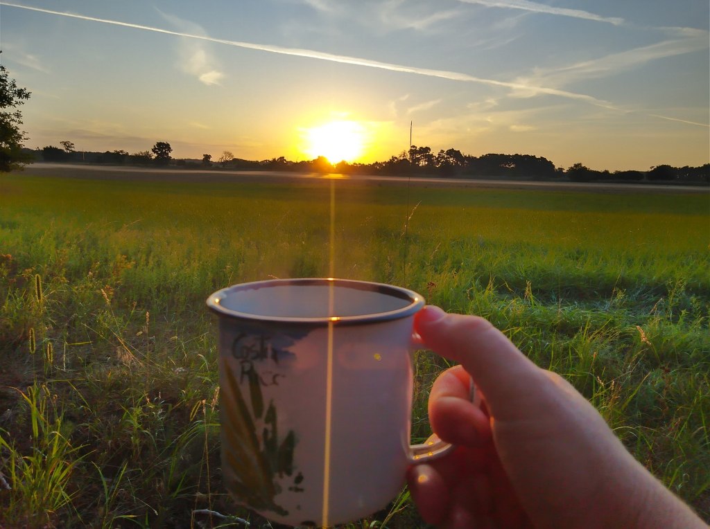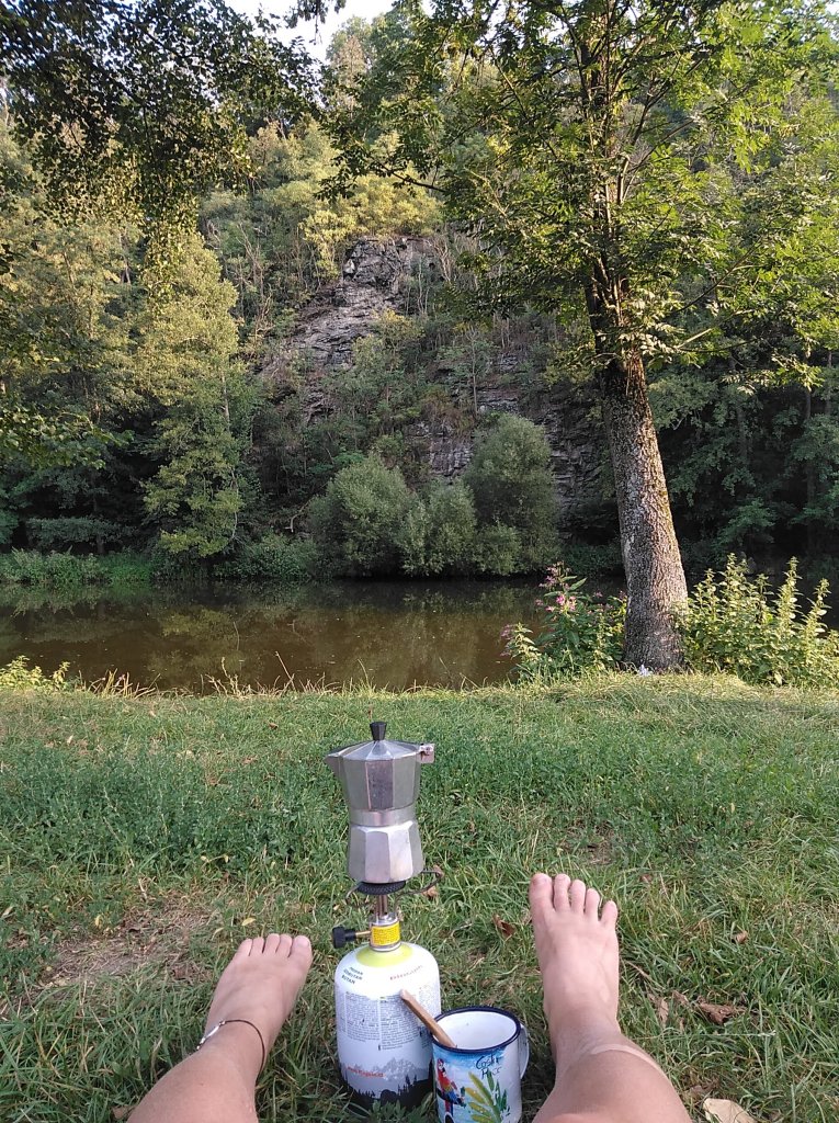 Ráno vstávám po páté, abych si užila svou neoblíbenější část dne na treku: vaření kafe za svítání a první kilometry v chládku a o samotě jen s probouzejícím se dnem, rosou, ptačím koncertem a pavoučky babileťáčky, jimž trhám čerstvě upředené sítě. Je to luxus vyběhnout si tu sjezdovku ještě bez pocení a užívat si výhledy ještě bez oparu, na severovýchod, kde se rýsuje cosi, co bude asi ten Blaník, bo nic většího tím směrem není. Lipová álej mě dovede k ústějovské kapličce, před níž z padlého kmene jedné z lip, zdánlivě mrtvého, vyráží celá štafeta nových stromků, některých už pěkně mohutných. Znovuzrození.