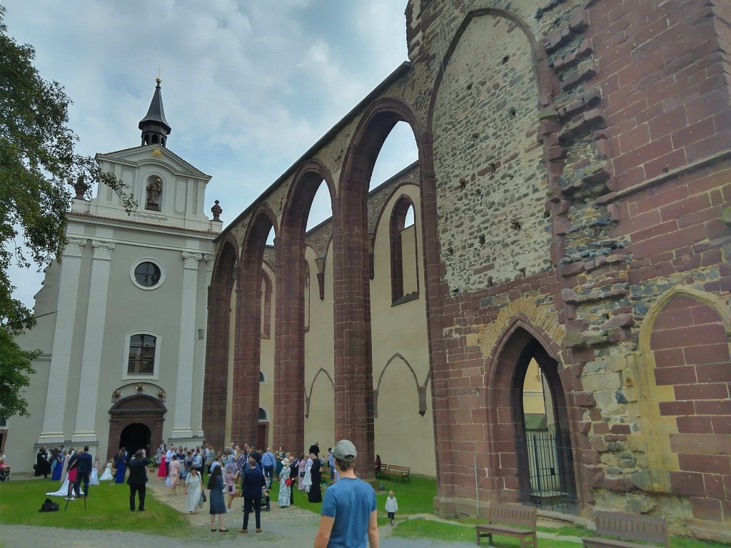 Po obligátním ranním koupání (kapr už někam poodplul) a kafíčku jsem si dala opět obligátní ranní kopeček na Rataje a pak pokračovala podél Sázavy a přes kopec do Sázavy. Tenhle úsek jsem šla minule jinou trasou, takže jsem si to teď patřičně užila: přes Ledečko (a já su cérka z Ledečka), Talmberk (skoro Štramberk) a Mrchojedy (trochu jsem se bála útoku, ale nic se nestalo, tak asi zas taková mrcha nejsem), kolem hustě oploceného areálu se zaparkovaným vrtulníkem (prý patří Adventistům, povídali okolo procházející trampi obalení v odéru travky), s koupačkou na jezu a výbornými knedlíky plněnými uzeným se zelím v kempu až k sázavskému klášteru. Příšerný dojem let covidových byl tentokrát poněkud zmírněn několika okolnostmi: jednak pěšinou podél řeky a parkem sázavského ostrova člověk přicházel zelení oddělen od té fabrikové a panelákové hrůzy, druhak v klášteře oprava výrazně pokročila, takže to tam už nevypadá tak bezútěšně, a konala se tam zrovna svatba, vše bylo tudíž patřičně načančané, sluníčko svítilo, nevěsta svítila a máslo na svatebních koláčcích taky pěkně svítilo a vesele žluklo.