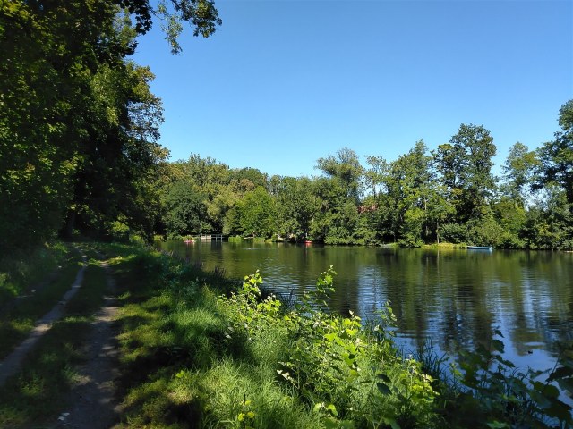 Vynechávám hřebínek se zříceninou Šelmberk (stejně je zavřeno a výhledy, soudíc dle výšky lesíka hradní věž obklopujícího, nebudou beztak valné) a místo toho volím alternativu po starém mlýnském náhonu v roští podél řeky Blanice. Dobře jsem udělala: je tu šance se smočit plecháčkovým způsobem a stínek je osvěžující, bo ta kula už zase pere. Náhon mě dovede až k nádherně opravenému Šelmberskému mlýnu, kde nějaký mladík zrovna v předzahrádce popíjí z pucláku kafe a druhý (už o něco starší mladík) vedle na rybniční hrázi rybaří. „Ale je tady krásně!“ obcházím ho a on zcela v duchu mé stezky přisvědčí: „Jo, tady jo!“