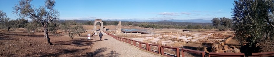 Po římské silnici přicházím jediná a zezadu. Po půldni mezi poli a loukami se přede mnou z ničeho nic najednou vynoří vítězný oblouk! Nic mě nevaruje, prostě je tu. Pomalu dojdu až pod něj a vychutnávám si tu chvíli. Tak jsem tu, u symbolu stezky Vía de la Plata. Teprve potom se rozhlížím a zjišťuju, že je tu archeologický areál s expozicí a promítací místností, podobně jako v Italice, ale kdyby zrovna nedorazil autobus se školní mládeží, nebyla by tu ani noha. Procházím se kolem, ale za chvíli mají zavírat bránu na polední pauzu a nerada bych tu zůstala trčet – cesta dnes bude ještě dlouhá. A tak u ruin lázní odposlouchávám kus výkladu nadšené průvodkyně znuděné pubertální mládeži a rychle mířím zpět k oblouku a zadní brance, protože tudy, nikoli autobusem po asfaltce, vede ta správná cesta.