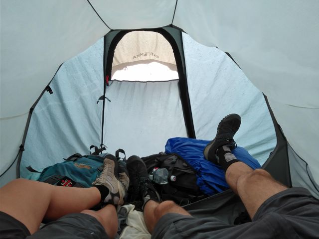 Ráno lije. Lije hodně a dlouho. Nepřestává lít. Čekáme na díru v lijáku. Díra nepřichází. Stan začíná nabírat spodem. Balíme. Opět sbaleni čekáme. Dokonce i usneme. V poledne se budíme. Díra v chcanci nikde, zato stan vypadá, že ještě chvilku, a nějakou díru nám předvede. Balíme stan v poryvech tajfunu a téměř běžíme (a místy i plaveme) těch 8 km na nejbližší nádraží. Místo dosažení pramene Svratky tak zatím dosahujeme pouze pramene horké kávy v Novém Městě.