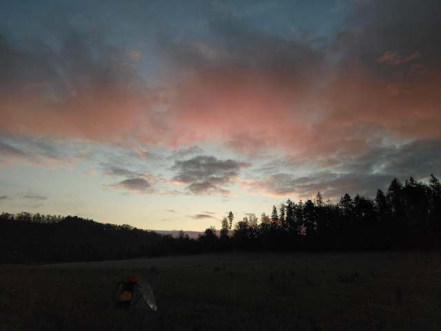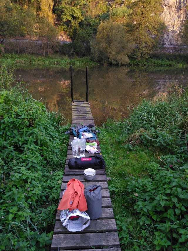Už se pomalu stmívá, ale beru nohy na ramena a upaluju dalších 5 km zpět, za několik ohybů řeky, přes les rezonující řevem motorových pil, až na širokou bezejmennou louku svažující se přímo k vodě. Skáču do proudu, než bude tma, stavím stan a vařím si kakajíčko na rybářském posezeníčku. Díky, řeko, konečně klid.